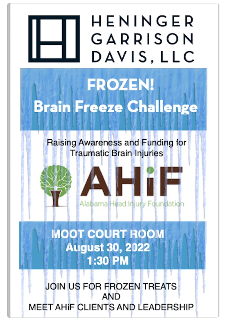 As proud partners with the Alabama Head Injury Foundation, Heninger Garrison Davis is excited to bring brain freezes to its Birmingham team on August 30 for the third annual challenge. The Brain Freeze Challenge, an initiative to spread awareness about traumatic brain injury (TBI), will combine favorite summer snacks like popsicles, ice cream, icees, and other cold treats with compassionate attorneys dedicated to helping clients receive compensation for complications associated with TBIs.