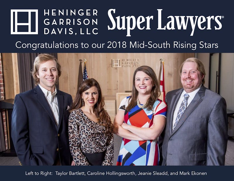 Heninger Garrison Davis is proud to announce that Taylor Bartlett, Mark Ekonen, Caroline Hollingsworth and Jeanie Sleadd have been selected to the Super Lawyers 2018 Mid-South Rising Stars list. Each year, no more than 2. 5 percent of the lawyers in the state are selected by the...