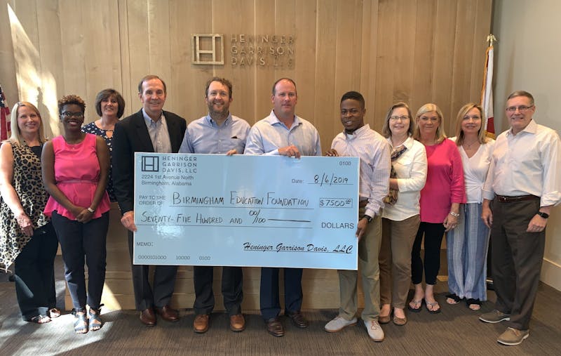 HGD team presents $7500 check to Birmingham Education Foundation’s J.W. Carpenter and Brad Jennings.. L-R: Katie Wagner, Lori Prince, Cheryl Thomas, Tim Davis, J.W. Carpenter, Erik Heninger, Brad Jennings, Mary Phillips, Pam Putman, Tzena Gauldin, and Bill Bross.