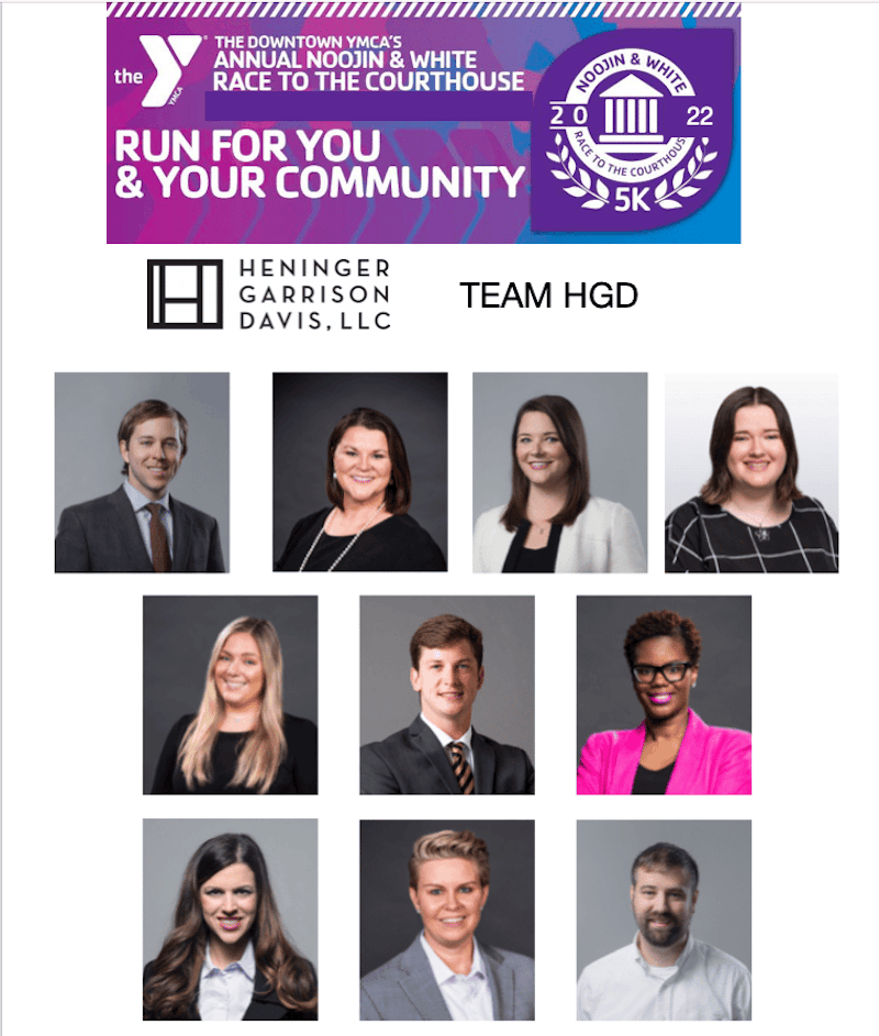Heninger Garrison Davis represented last Saturday at The Noojin & White Race to the Courthouse supporting the YMCA with this amazing team: Team HGD: Taylor Bartlett, Caroline Hollingsworth, Brandy Robertson, Jeanie Sleadd, Luke Huffstutler, Brian Stack, Catherine Davis, Allison Rice, Lori Dent, and Lily Hulcher.